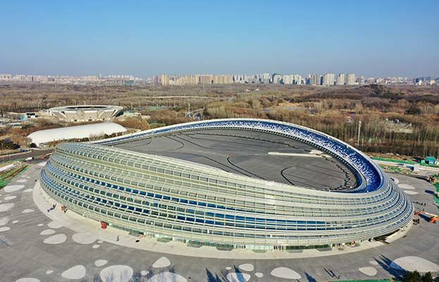 国家速滑馆是北京2022年冬奥会北京赛区新建的标志性场馆,位于奥林匹克森林公园南园西北侧,北邻国家网球中心,东临奥林西路、西临林萃路。速滑馆屋面外缘设有建筑一体化的太阳能光伏电力系统,蓝色的单元电池板自屋顶外边缘向内侧渐变排列,如同正在融化的雪,展现冬季运动的特色。